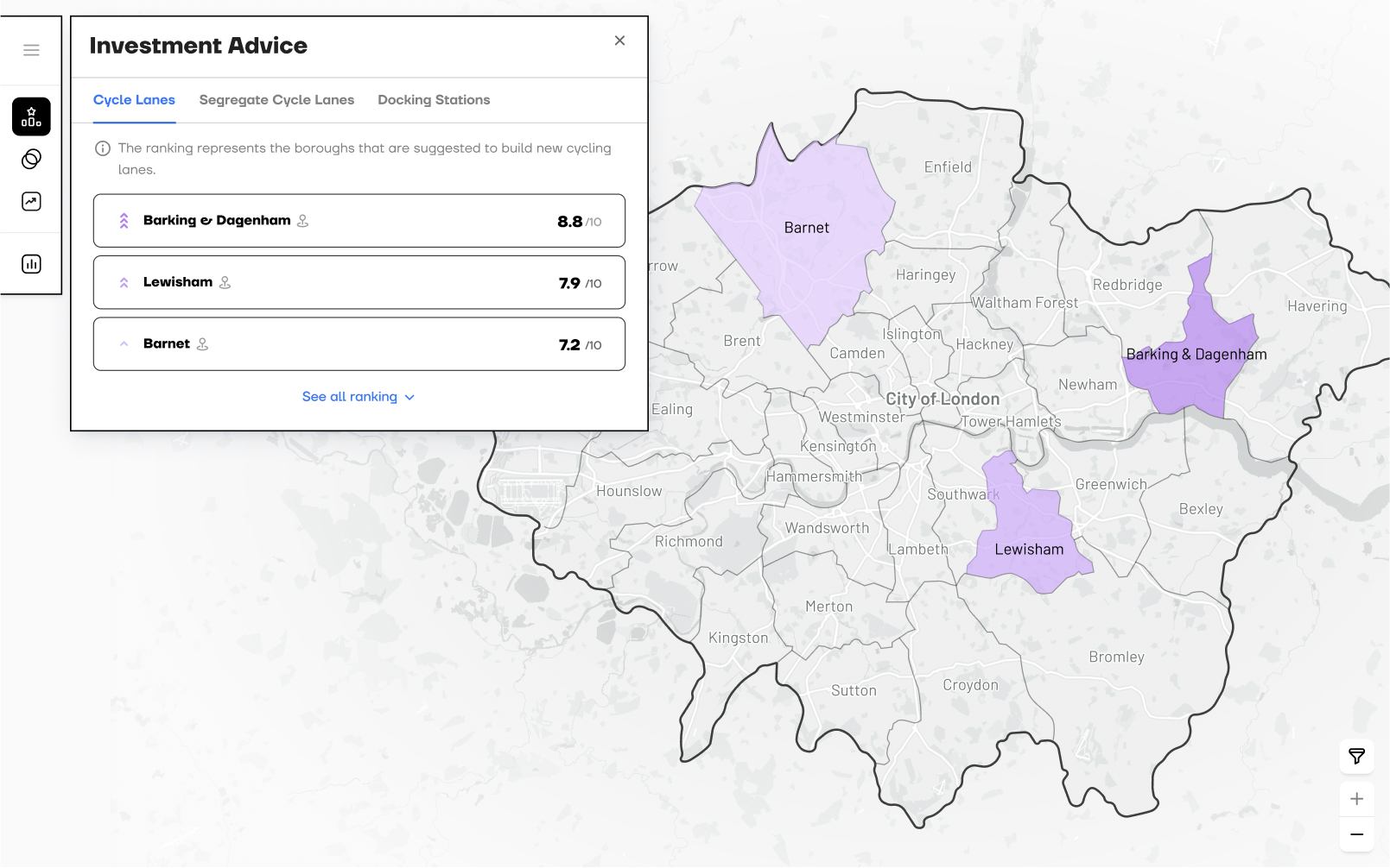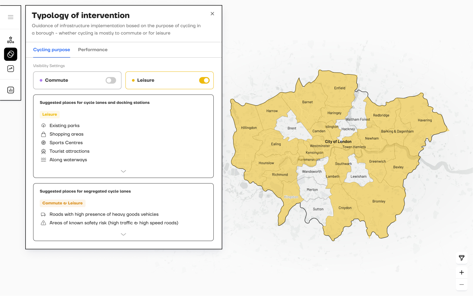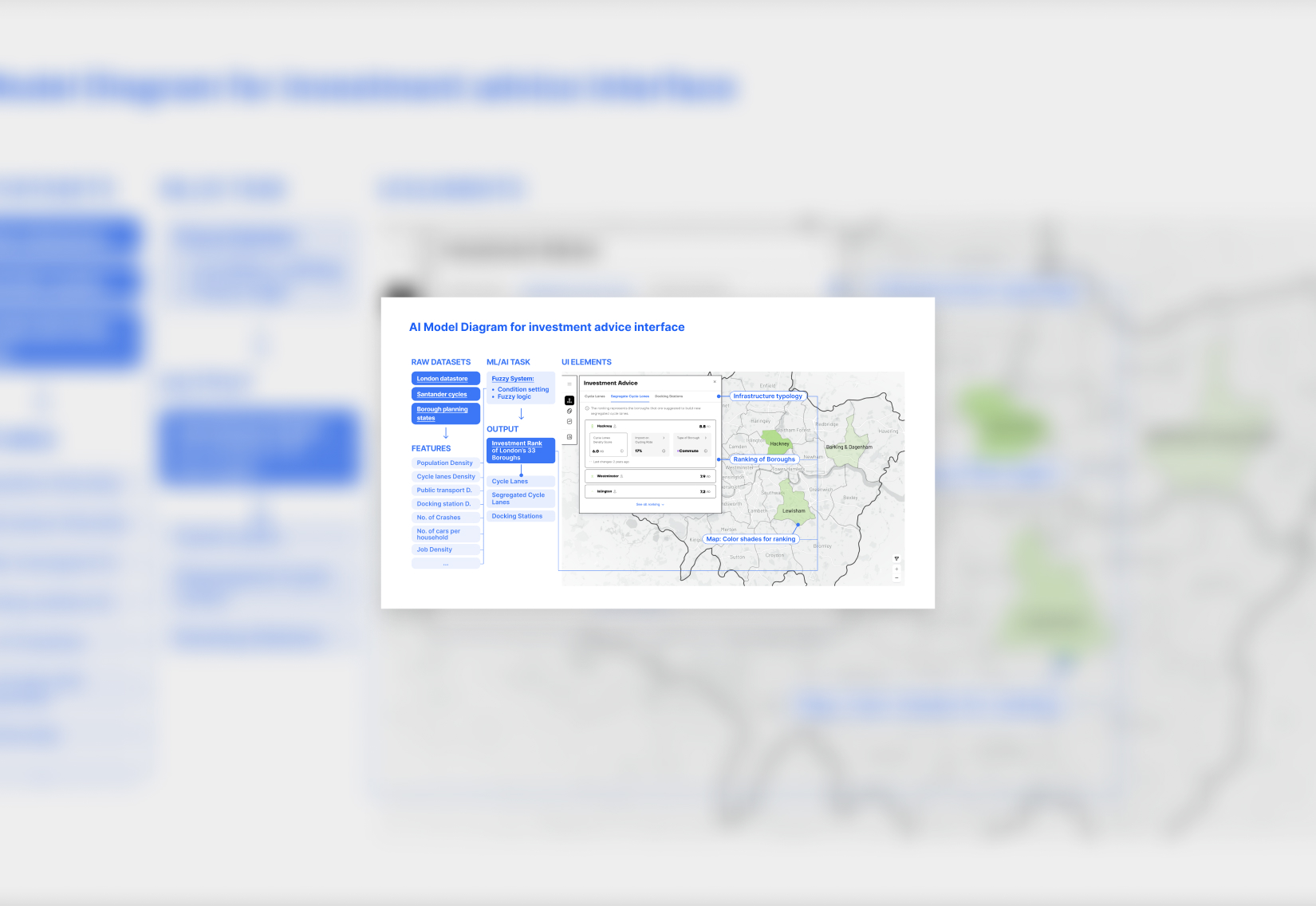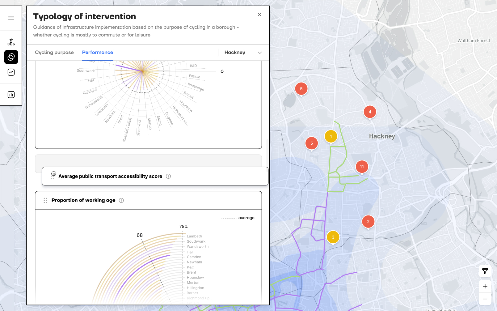 The dashboard centres on three parts: the map, navigation bar, and modals. The map and nav bar are always visible, guiding every interaction. Modals change based on what the user selects, and the map’s behaviour adapts accordingly. The design uses brand colours plus distinct hues to clearly show different data on the map.