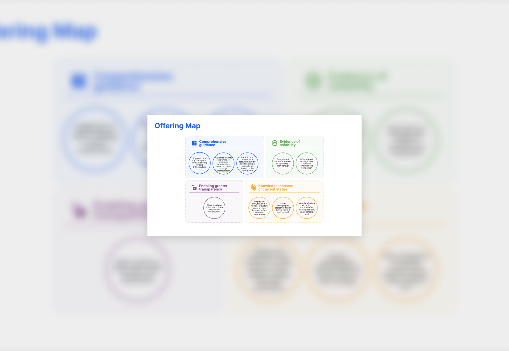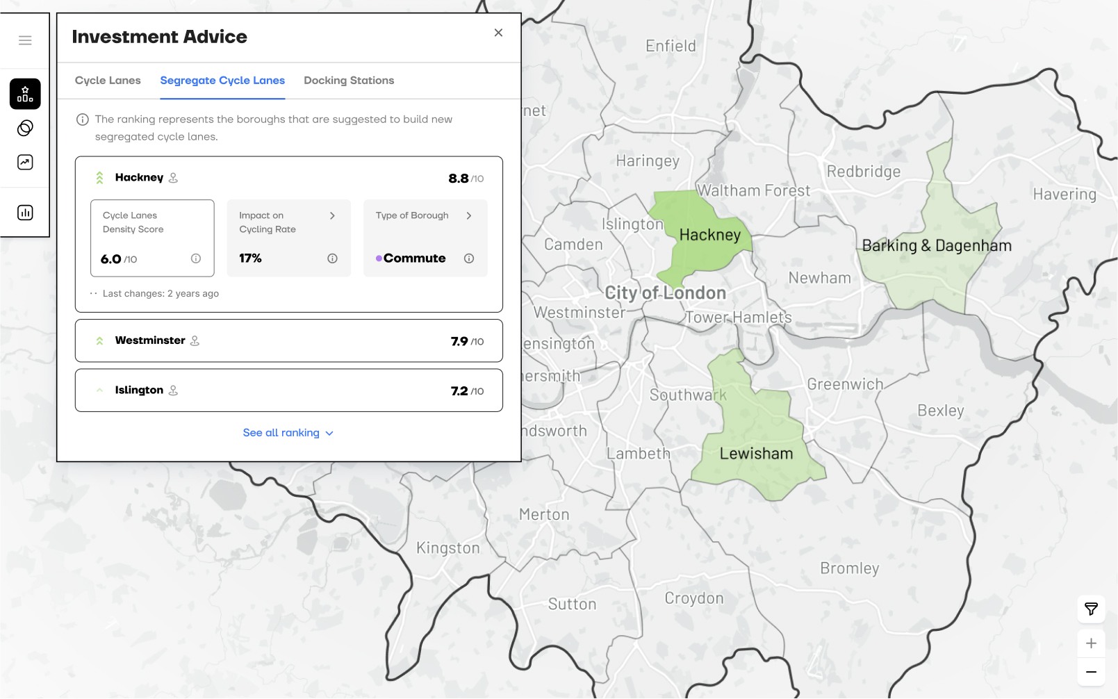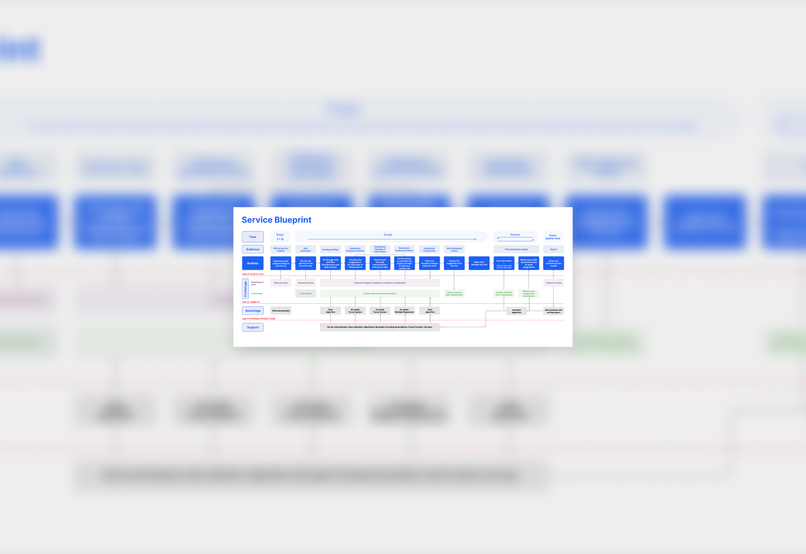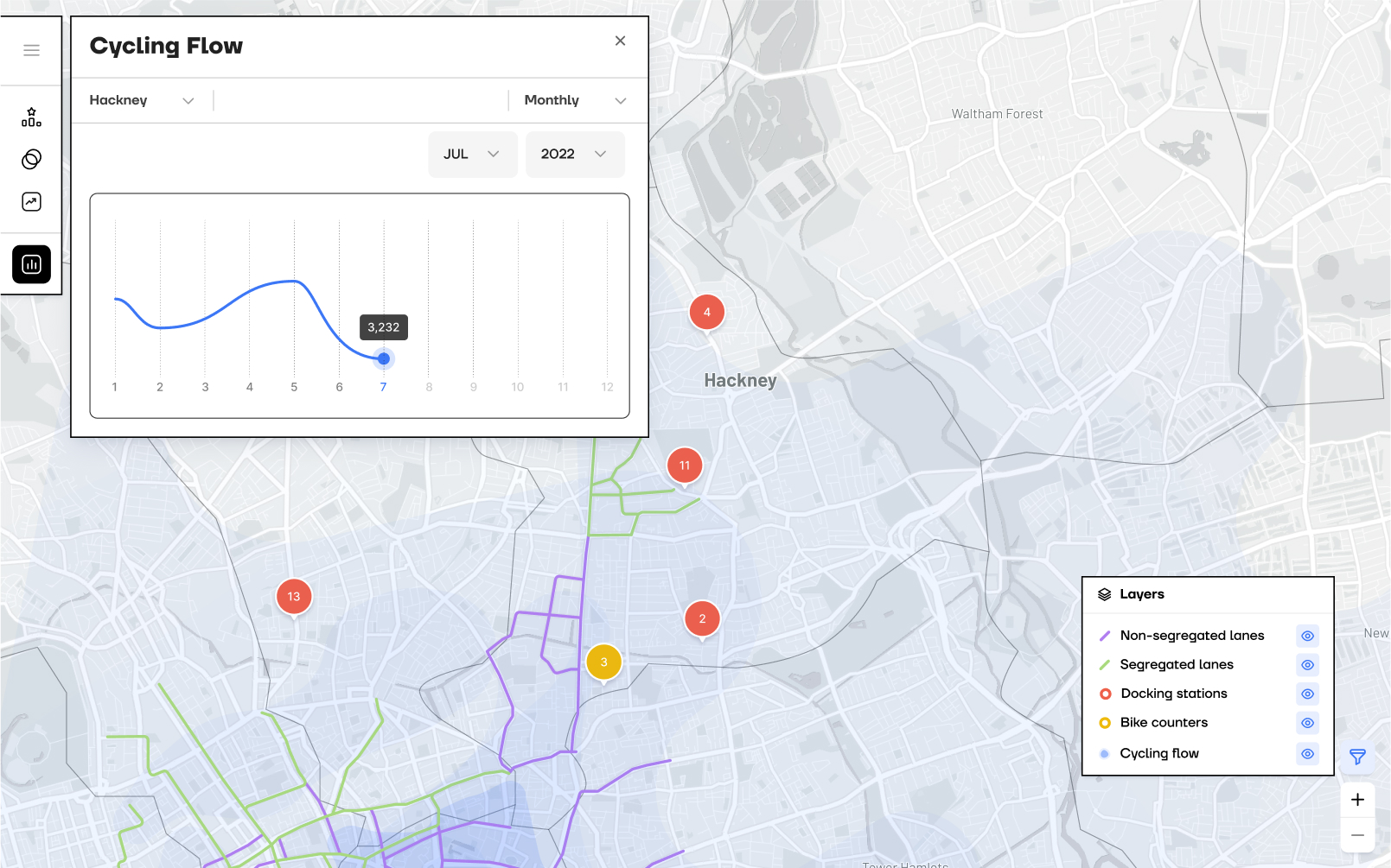 The dashboard centres on three parts: the map, navigation bar, and modals. The map and nav bar are always visible, guiding every interaction. Modals change based on what the user selects, and the map’s behaviour adapts accordingly. The design uses brand colours plus distinct hues to clearly show different data on the map.