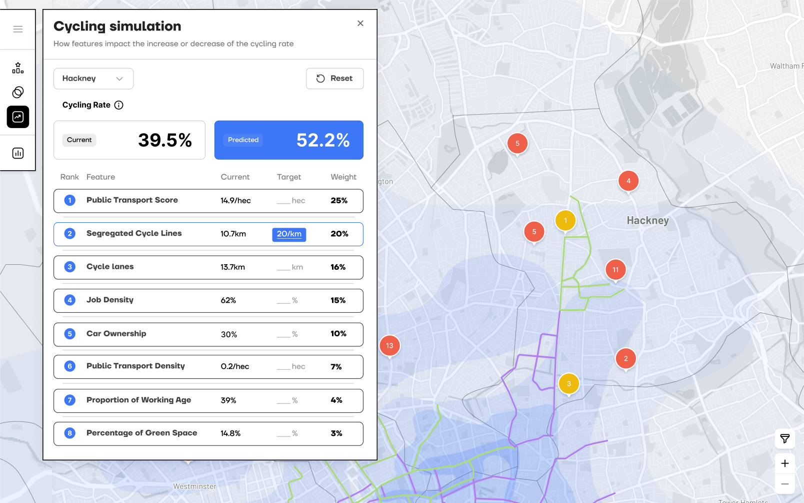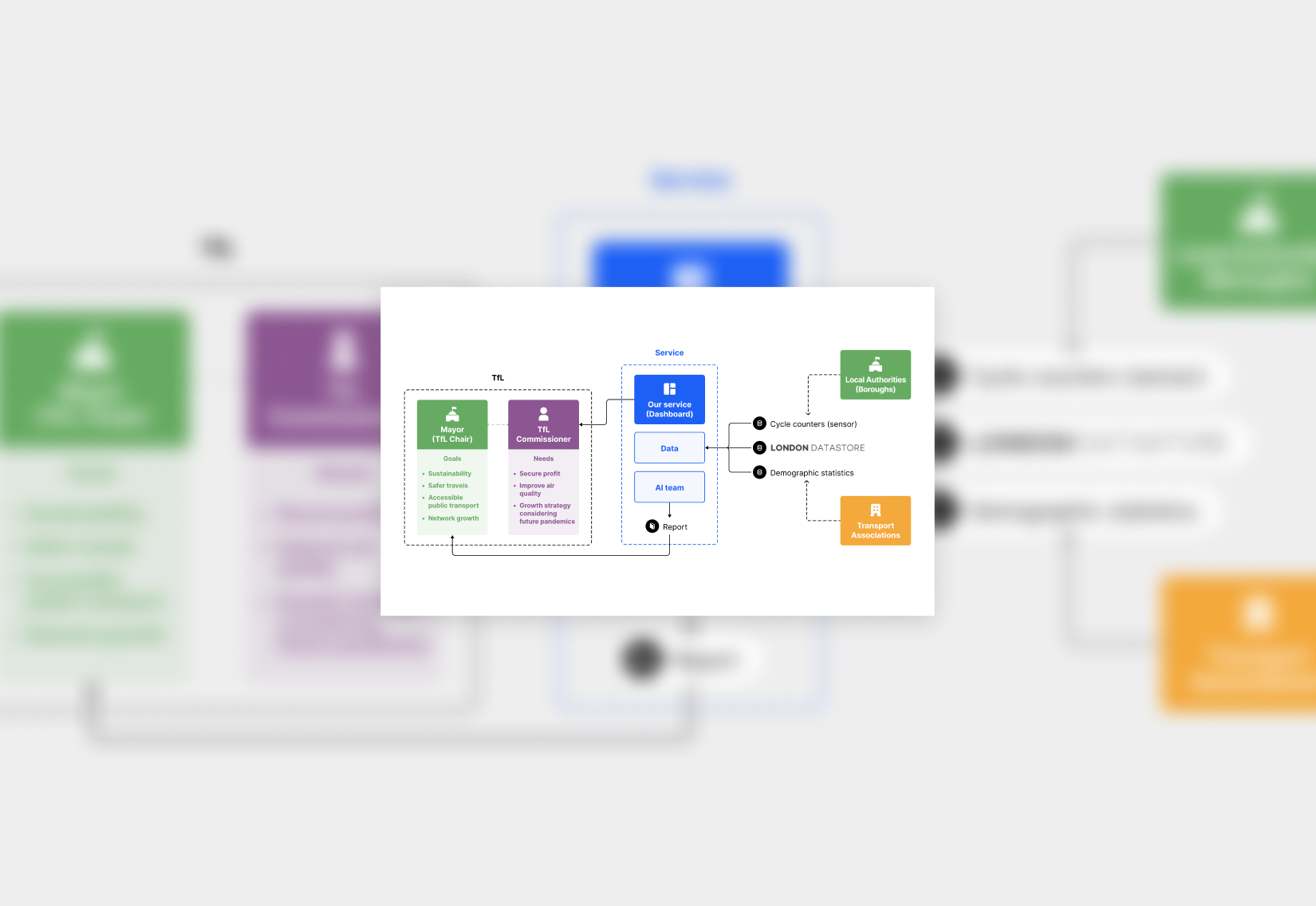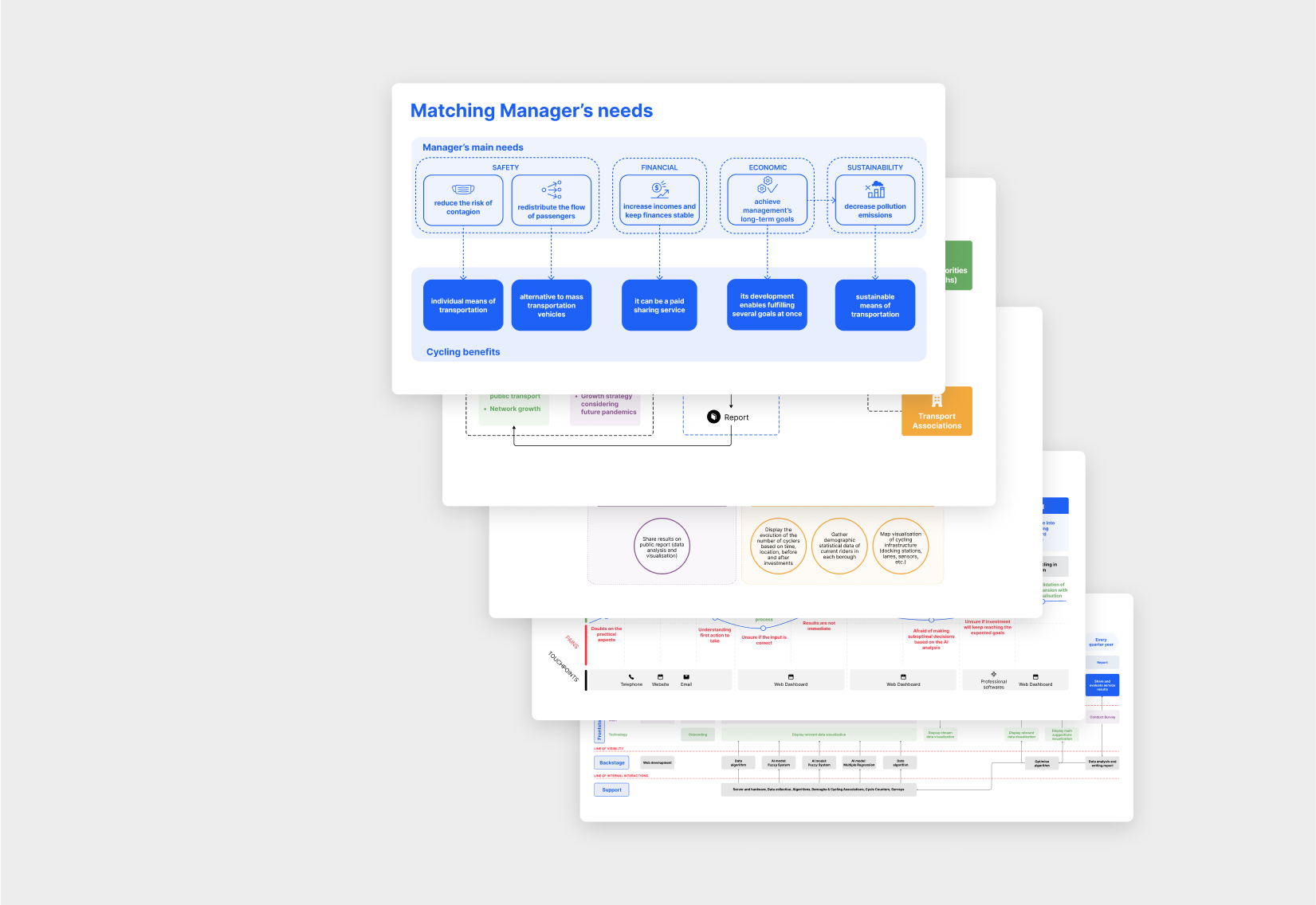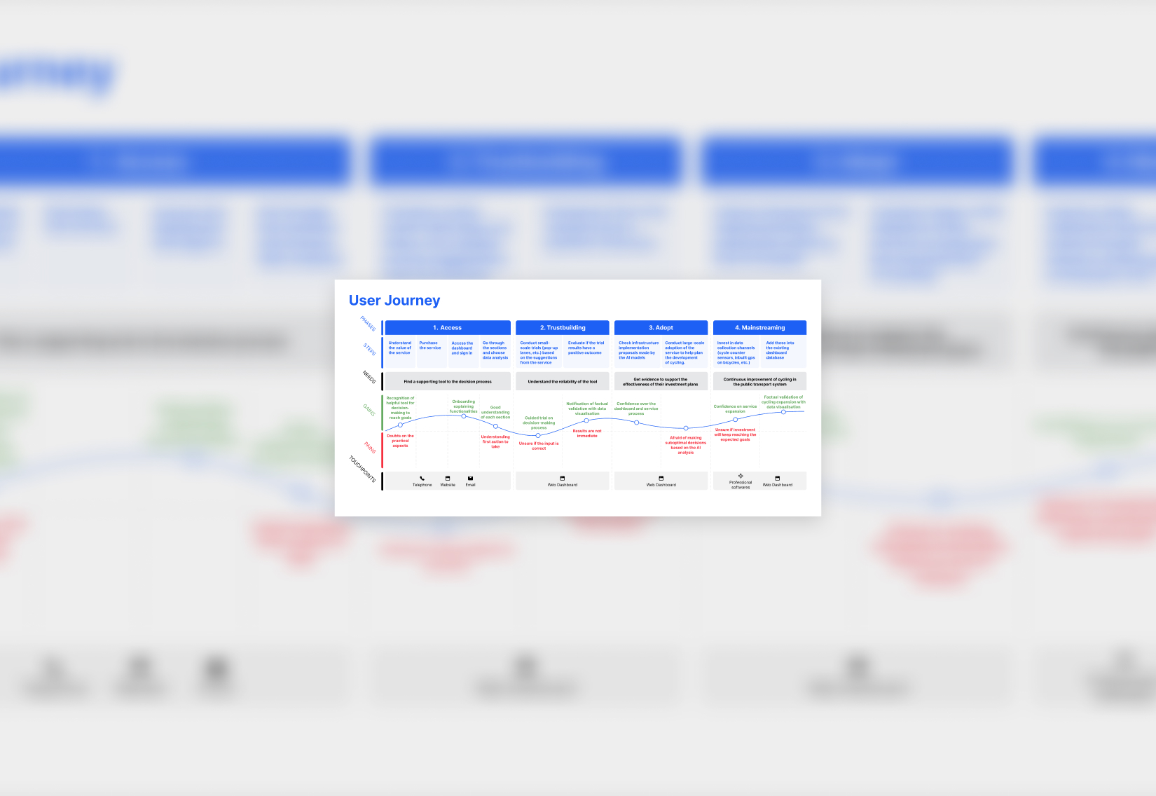 The dashboard centres on three parts: the map, navigation bar, and modals. The map and nav bar are always visible, guiding every interaction. Modals change based on what the user selects, and the map’s behaviour adapts accordingly. The design uses brand colours plus distinct hues to clearly show different data on the map.