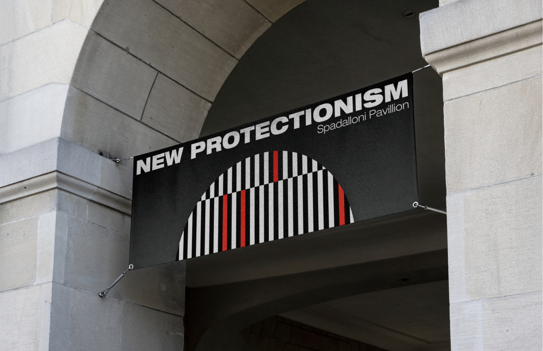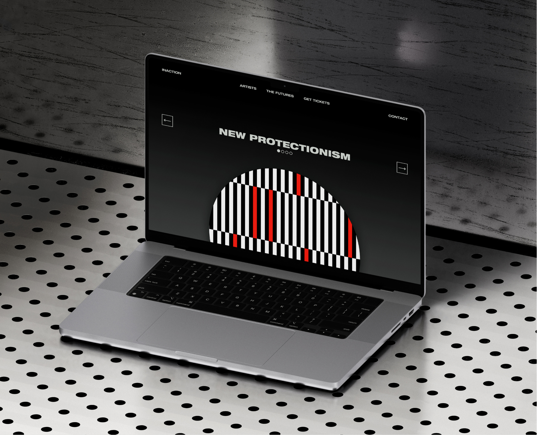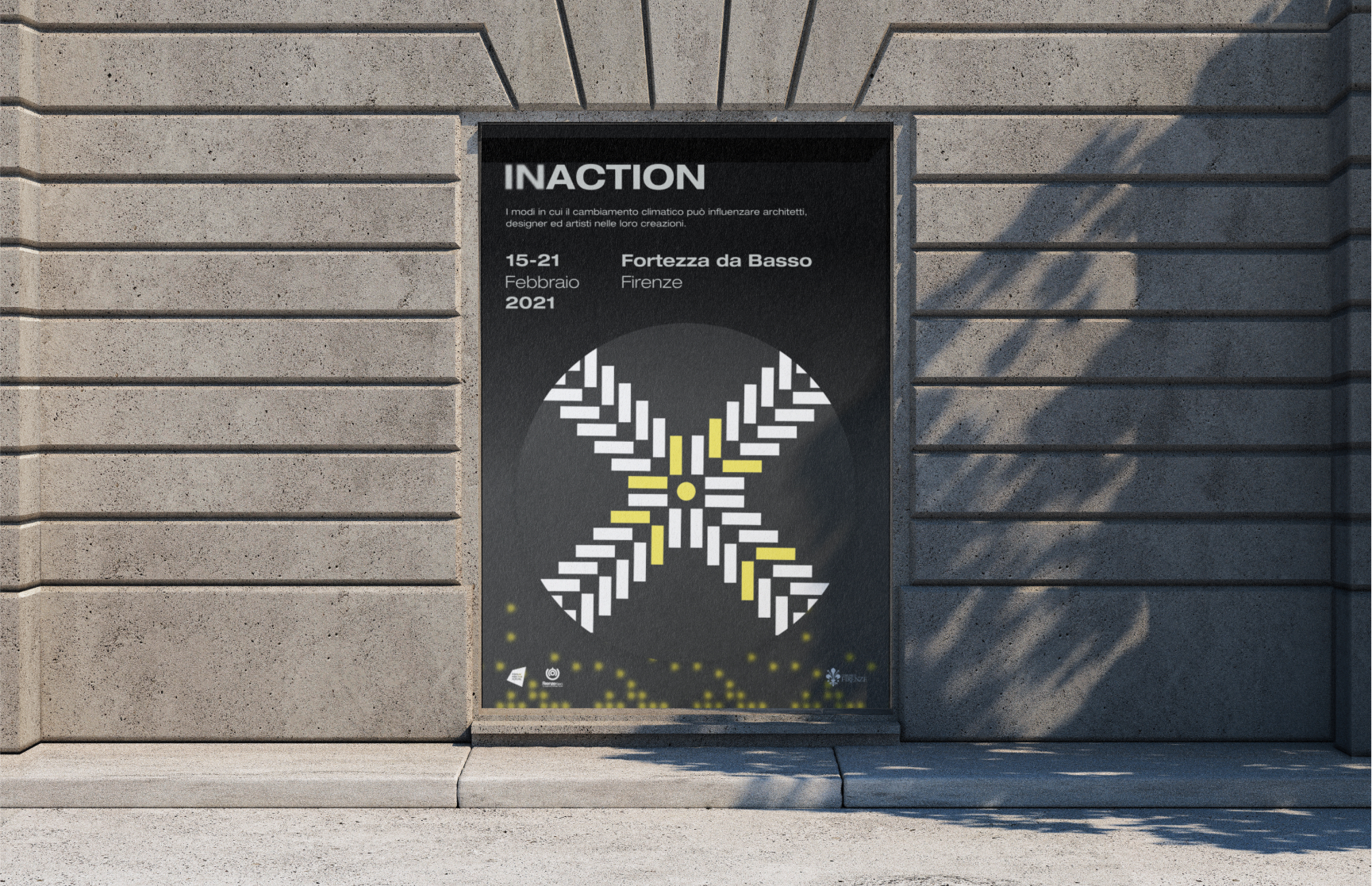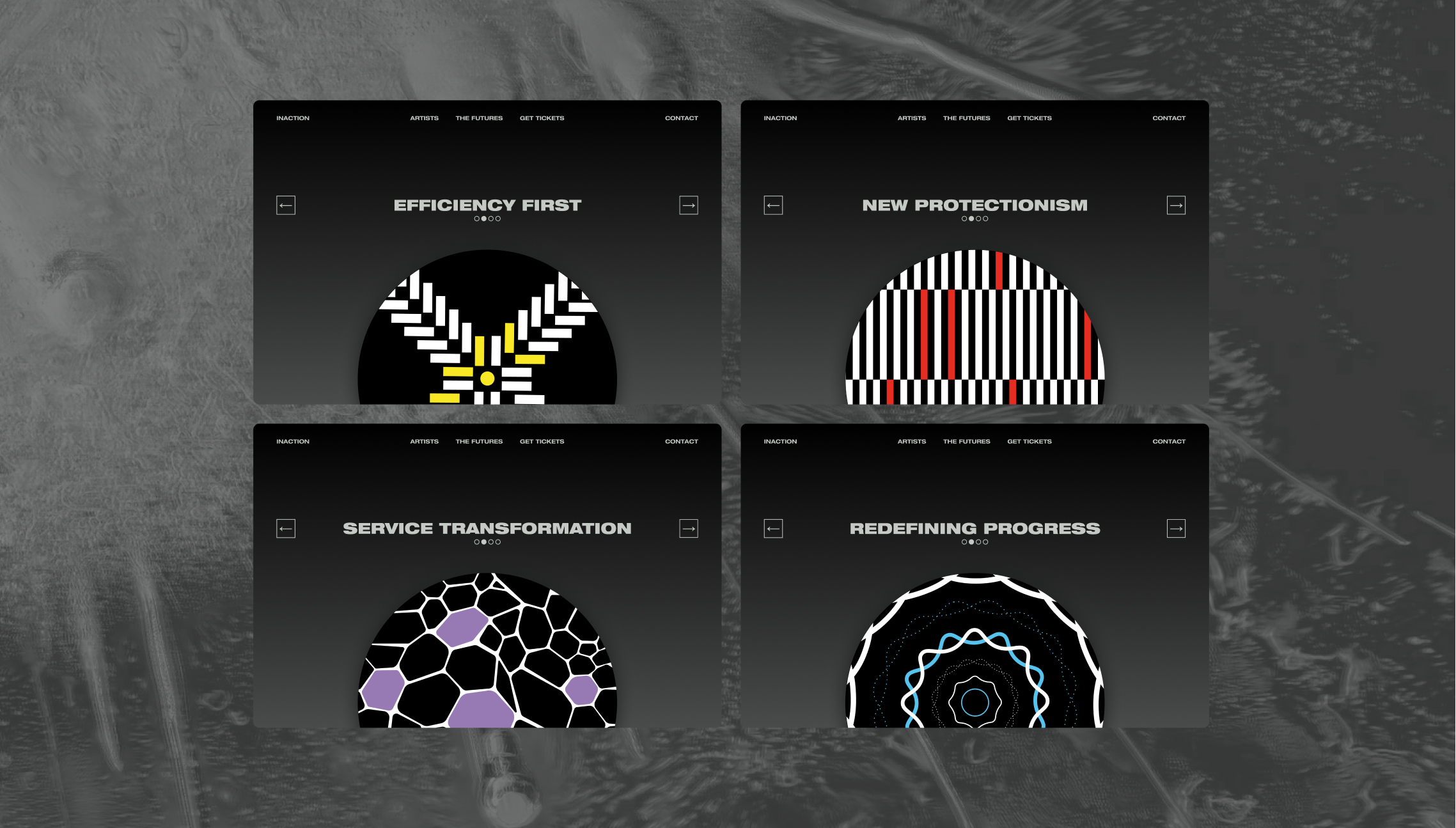 The logo’s blurred “in” invites dual readings, “action” or “inaction,” reflecting our choices or lack thereof in addressing global warming. Helvetica Extended, shifting from light to black, represents contrasting, evolving futures. Colours, shapes, and patterns each symbolise one of four possible futures, while the grey-to-black gradient conveys uncertainty and the discomfort of facing an unknown path ahead.