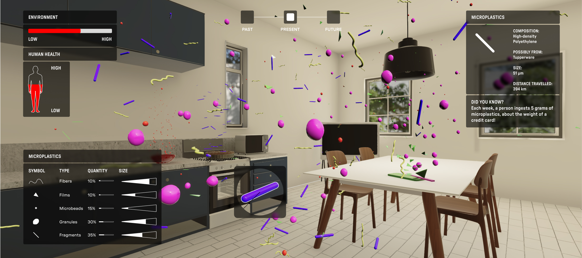 Life in Plastic is a virtual reality experience that immerses users in the hidden world of microplastics, transforming awareness into action. Through a gamified, three-chapter journey, participants witness the lasting impact of plastic on the body and environment. In the end, they realise the unsettling truth: microplastics cannot be undone. Through this immersive experience, Life in Plastic challenges users to rethink their relationship with plastic.