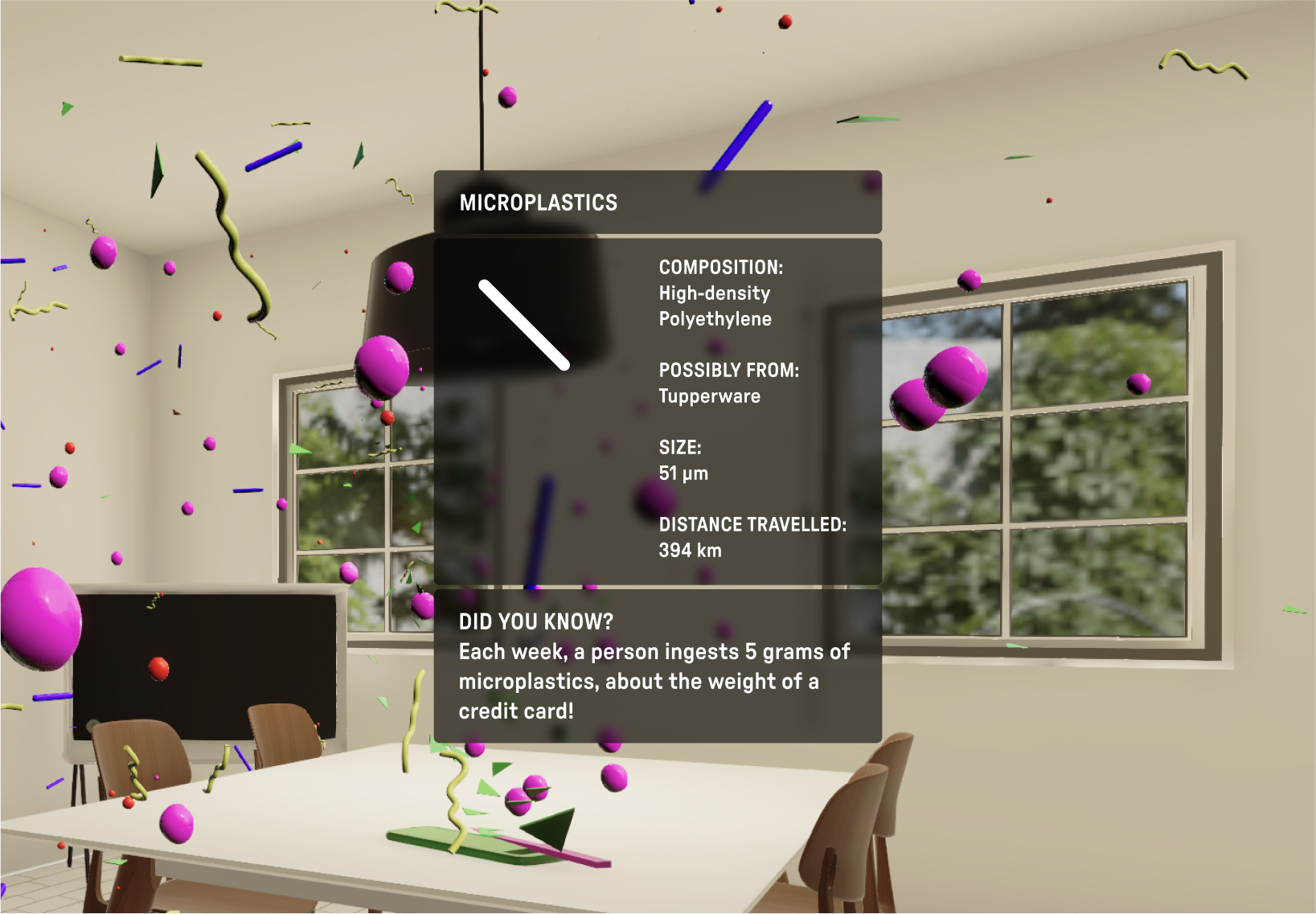 The user, now in present time, visualises the levels of microplastics rising in the body and the environment. As they breathe, they can also see themselves inhaling the microplastics present in the air.